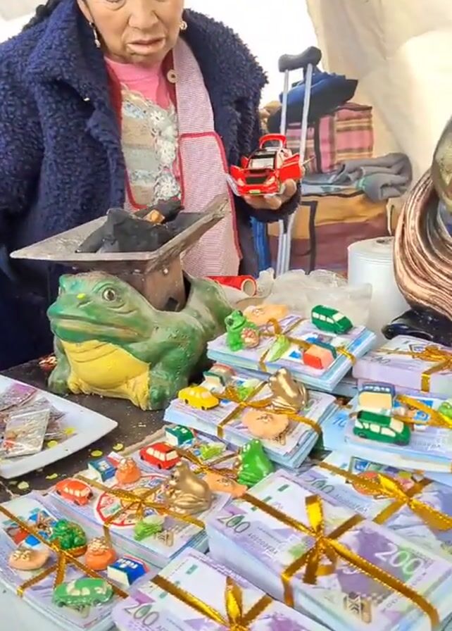 A woman stands behind a table covered with stacks of play money, some of which are wrapped with gold ribbon and topped with small ceramic figurines of animals or cars. There is a ceramic frog on the table, as well as a small metal structure with burning incense. Behind the stacks of money are figurines, including Buddha and an elephant. The woman wears a brown knit hat, a blue coat, and a pink shirt. The table is located under a tent or canopy, and in the background, there are crutches and other objects. The scene appears to be at a market or fair.