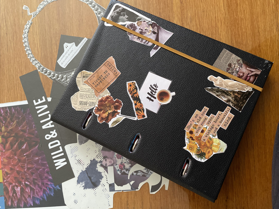 The image displays a flat lay composition centered on a black, textured, three-ring binder or journal positioned diagonally on a smooth wooden surface. The binder exhibits three oval-shaped openings on its left spine, revealing a metallic ring mechanism. A golden-yellow elastic band stretches vertically around the binder's right side, acting as a closure. The binder's cover is decorated with various stickers and paper cut-outs, including: a heart-shaped piece made from old newspaper print with "FAITS-DIVERS" visible; a sticker of a large, dark orange flower; a torn-edge sticker labeled "TICKET TO HAPPINESS" with "ADMIT ONE" and "581196"; a rectangular sticker featuring orange flowers on a black background; a white rectangular sticker with "hello" in cursive script and a small coffee cup illustration; a sticker depicting a vase of sunflowers; a rectangular sticker containing the text "She's an old soul with young eyes, a vintage heart, and a beautiful mind."; a cut-out of a classical white statue against a dark background; and a collage-style sticker showing a partial human face with floral and newspaper elements. Scattered on the wooden surface around the binder are several paper items: a printed image of a multi-colored, spiky botanical form; a black strip of paper with "WILD & ALIVE" in white capital letters; a white lace-patterned cut-out overlaid on a dark abstract shape; a fashion photograph of a female model wearing a floral top; a silver-colored chain necklace cut-out; and a white rectangular card with Spanish text reading, "La moda está al servicio de tu estilo de vida." The background is a light brown wooden surface, likely a table or desk, with discernible grain. The scene is uniformly lit. No individuals are present. The specific location in the city of San Sebastián de Aparicio, Mexico, cannot be determined from the visual information provided.