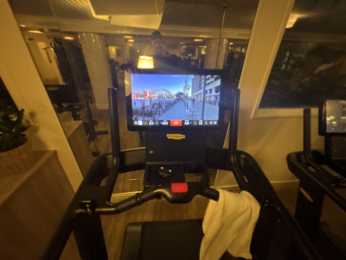 A treadmill dominates the foreground, its screen displaying a waterfront scene with a prominent bridge