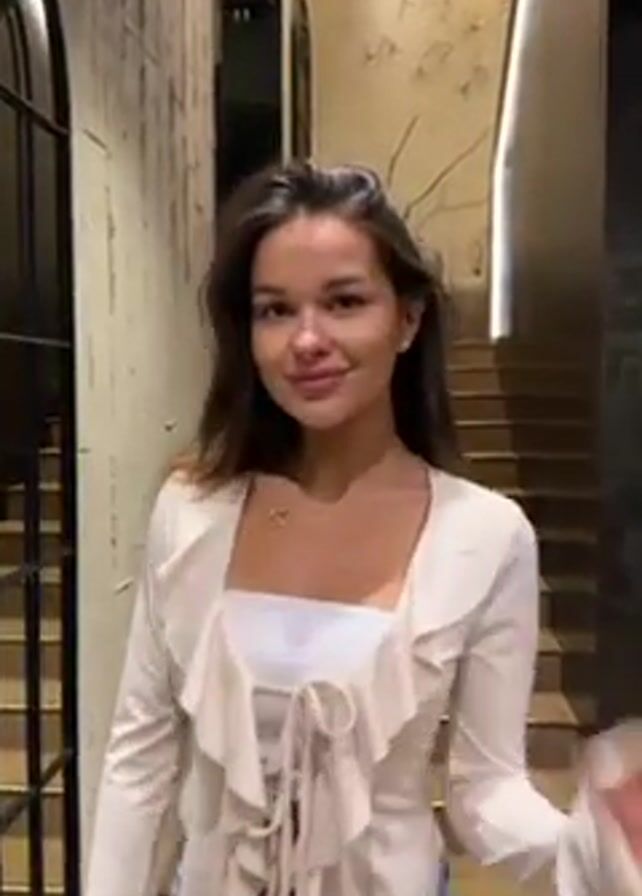 A young woman with long brown hair, wearing a white top and blue jeans, poses indoors. She stands in front of a staircase with gold-colored metal accents. The wall behind her features decorative elements and arched openings, while a black framed mirror is to her left. She turns towards the camera, smiling and briefly touching her hair. She then spins around, her hair swirling, and turns back to face the camera with a smile.