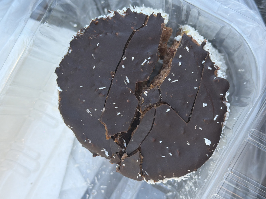- "A single, round chocolate and coconut pastry is depicted resting inside a clear, rigid plastic clamshell container" by FM-BM82D3, licensed under CC BY 4.0