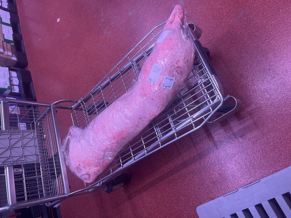 The image depicts a whole, small, raw animal carcass, resembling a suckling pig, fully encased in clear plastic wrap. This item rests on the lower wire shelf of a silver-colored, four-wheeled metal utility cart. Two white labels are affixed to the plastic wrap; one reads "МЕРО Варна", identifying the location as Varna, Bulgaria, and another, positioned further along the item, indicates "2.40 kg" as its weight. The cart is positioned on a red, textured industrial floor. In the background, stacked cardboard boxes on pallets are visible, indicative of a commercial storage or processing environment. No individuals, direct actions, or interactions are present in this static scene.