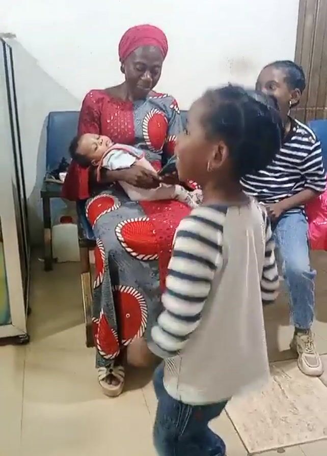 An indoor shot shows a woman sitting in a blue chair, holding a baby, while two young girls stand nearby. The woman wears a red head covering and a patterned dress. The baby is dressed in white. One girl is dancing in front of the woman, wearing a striped shirt and jeans. The other girl sits in a blue chair behind the dancing girl, wearing a striped shirt and jeans, and holding a pink bag. A refrigerator is visible in the background to the left. A sign on the wall reads "Your Family Planner". The scene includes movement and interaction, with the dancing girl and the woman engaging visually.