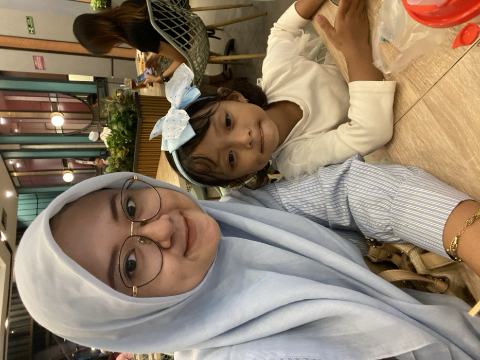 The image portrays an adult female and a young child seated at a light-colored wooden table in a dining establishment located in Sidoarjo, Indonesia. The adult female, positioned on the left and partially cropped, wears a light blue hijab, gold-rimmed glasses, and a light blue and white striped long-sleeved shirt. A gold-colored bracelet is visible on her right wrist. She is looking towards the camera with a slight smile. The child, a young girl, is seated to the right of the adult, wearing a white long-sleeved top and a light blue headband with a large, lacy bow. Her expression is neutral as she faces the camera, with her hands resting on the table. On the table to the child's right, a red child's cup and a clear plastic item are visible. In the background, another individual with long dark hair is seated at a separate table, facing away from the camera, and appears to be interacting with a smartphone. This individual's table holds a drink and food. The restaurant interior features decorative walls with vertical panels in teal, pink, and other colors, accented by circular reflective elements and multiple light fixtures. Green foliage in planters serves as a divider. An emergency exit sign is visible on the far right wall. Other patrons are present in the blurred background.