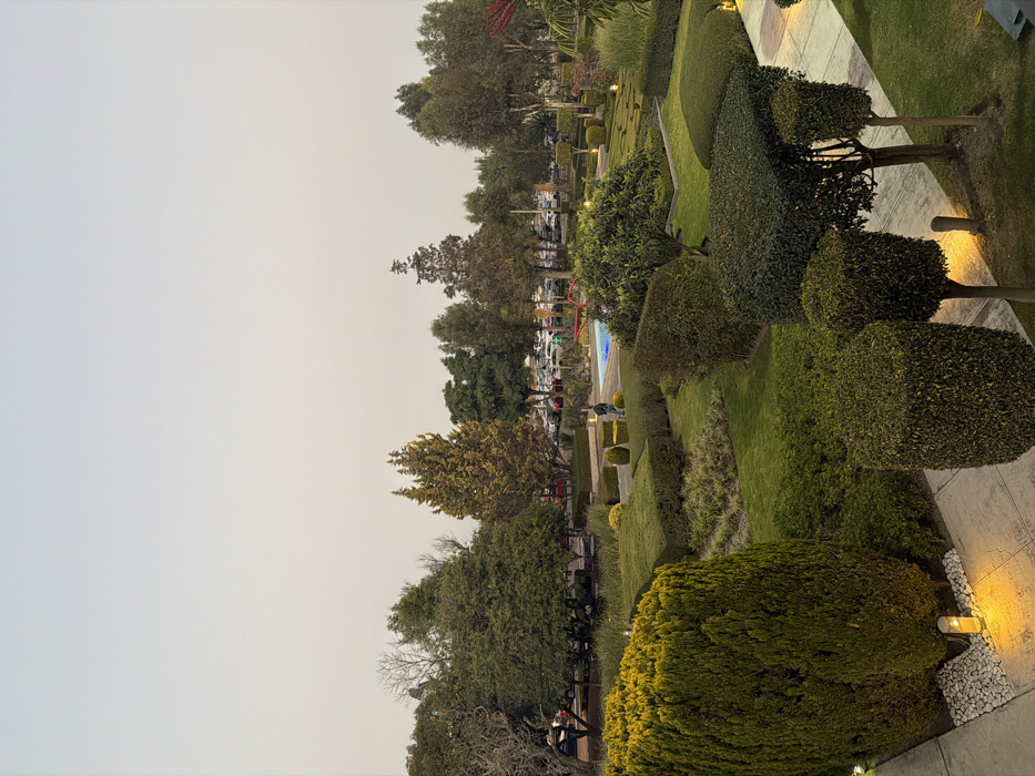 An aerial view reveals a manicured garden with meticulously trimmed bushes and trees alongside a stone path illuminated by ground-level lamps. In the background, other trees and a parking area are visible. The overall lighting suggests either dusk or a dimly lit setting. The sky is obscured by a light fog or haze. The composition is vertical.