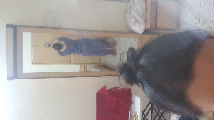 The image depicts an indoor residential scene in Kolkata, India. A person's head, showing dark hair styled in a bun, occupies the lower foreground, indicating the perspective of the photographer. Directly in front, a full-length mirror, encased in a light wooden frame, reflects a second individual. This reflected person, seen from the back, wears a dark blue patterned garment, possibly a kurta, over brown legwear and brown footwear. She holds a white smartphone aloft with both hands, actively capturing her reflection in the mirror. The mirror's reflection also reveals light-colored wooden wardrobe doors and a portion of a bed with a white mattress. To the left of the mirror, a small white foldable table is partially visible, draped with a red patterned fabric, with yellow items resting on its surface. To the right, a light-colored wooden stool or box is topped with a folded white cloth. The walls are a light neutral color, and the floor is tiled with light-colored square tiles. A white electrical switch plate is mounted on the wall to the right of the mirror.
