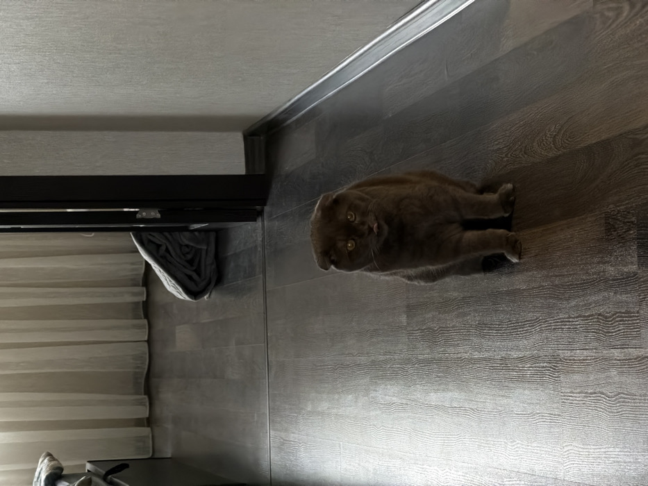Inside a residential dwelling, Unknown, Unknown, a medium-sized Scottish Fold cat with dark brown fur and yellow eyes is depicted