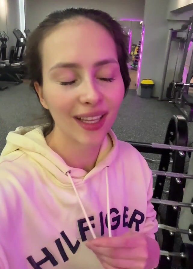 A woman is standing in a gym. She is facing the camera. She is wearing a cream-colored hooded sweatshirt with the word “HILFIGER” in large black letters on the front. The gym equipment is visible behind her. There are other people in the background. The lighting in the gym is bright, and there is a pink-purple hue to the light. The woman smiles and talks to the camera. She pulls at the drawstring on her hoodie.
