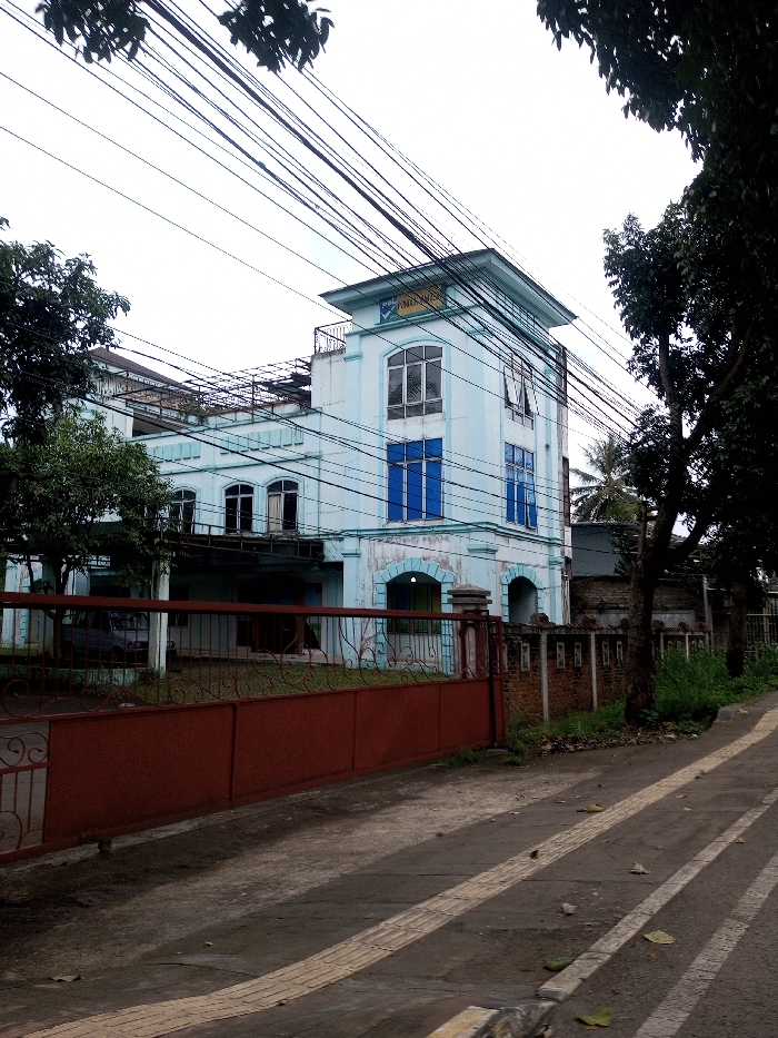 The image depicts a light blue, multi-story building situated in Khajuripada, India, viewed from an oblique angle across a paved surface. The building features a prominent central section with an overhanging flat roof and decorative railings. A yellow sign bearing partially legible text, "PONDOK MA...", is affixed to the upper facade. The building's exterior exhibits arched window frames on the ground floor and rectangular windows on upper floors; some windows on the central section appear to have a blue tint or covering. Weathering and discoloration are visible on the paintwork. In the foreground, a large, reddish-brown metal gate, combining solid panels with wrought iron-style decorative elements, spans the property's entrance. Behind the gate, a silver-colored vehicle, possibly a van or SUV, is partially visible. To the right of the gate, a low brick wall topped with concrete elements and some overgrown vegetation extends along the property line. Overhead, numerous dark utility wires crisscross the frame against a bright, overcast sky. Lush green foliage from trees frames the upper left and right corners, with additional trees and a palm visible behind the building. The paved surface in the immediate foreground features tactile paving strips. No individuals are present in the scene.