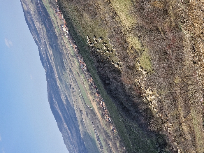 This image presents a panoramic view of a rural, hilly landscape in Porumbenii Mari, Romania. The scene is captured from an elevated perspective, looking down a significant incline. The foreground and mid-ground consist of a steep slope covered with a mix of dry, brownish-green grass, bare soil, and numerous leafless deciduous shrubs and small trees. Approximately 60 to 80 white-fleeced sheep are scattered across this slope, some appearing to graze, others stationary. Diagonally across the mid-ground, a valley extends, containing a village composed of numerous houses with distinct reddish-orange tiled roofs, interspersed with patches of green vegetation and bare trees. Beyond the village, a series of undulating hills or mountains rise in the background, exhibiting varied terrain with sparse tree lines, gradually fading into the horizon. The sky is clear, light blue, with minimal wispy white cloud cover. No human figures are discernible.
