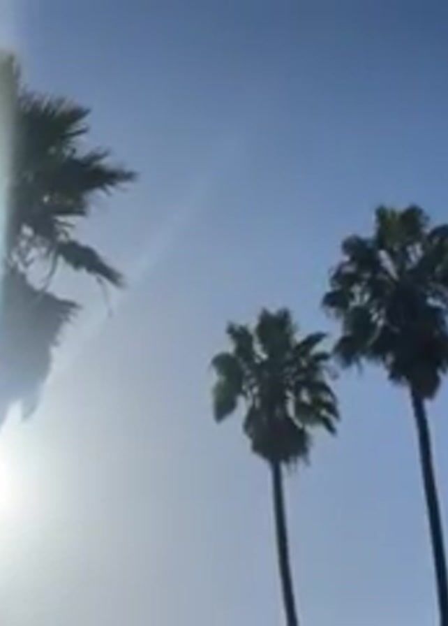 several palm trees against a clear blue sky. The sun is shining brightly, causing a glare behind one of the palm trees. The camera angle is looking up at the trees.