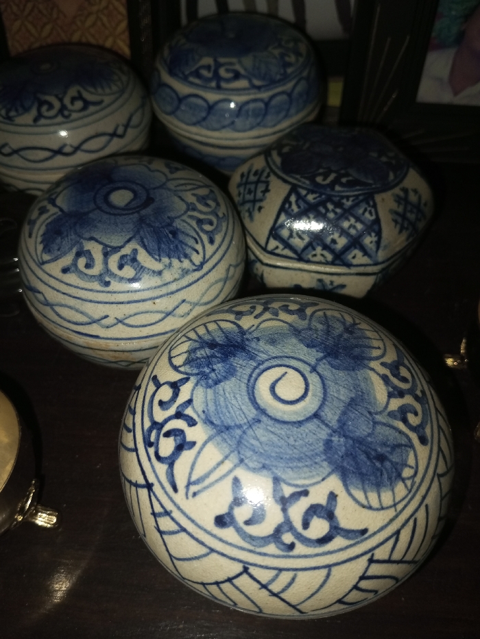 Five decorative porcelain balls with blue and white designs are arranged on a dark surface. Most are spherical, adorned with floral motifs and geometric patterns. One is shaped like a polygon. The designs feature varying blue shades, applied with a somewhat worn or vintage aesthetic. A partial view of an object with gold-colored detailing is visible on the left. A framed picture is partially visible in the background.