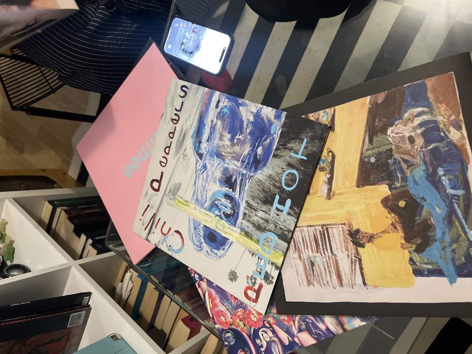 A phone rests atop a stack including a pink book and Red Hot Chili Peppers’ “Dream Canteen” album. The stack sits on a glass-topped surface with books below. Another abstract painted canvas with yellow and blue hues rests to the side. The background includes a black and white striped surface and a white bookshelf filled with books.