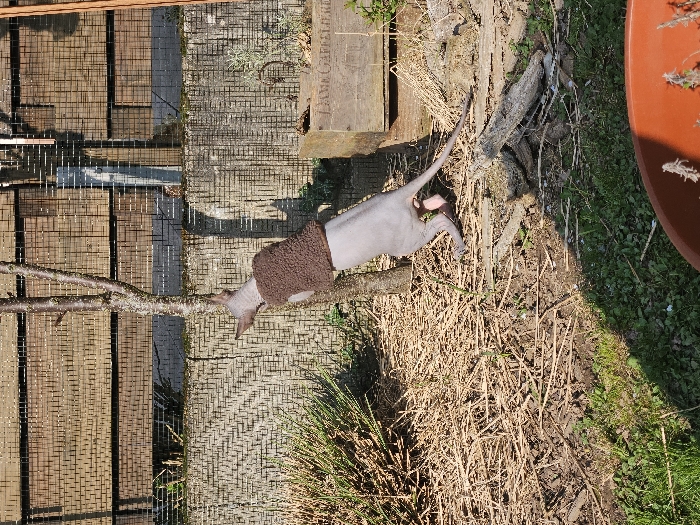 - "A pale grey-pink hairless cat, wearing a brown textured sweater, is captured mid-action, actively engaging with a slender tree trunk" by FM-012eU2, licensed under CC BY 4.0