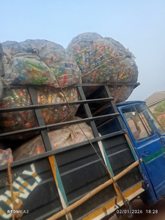 A blue truck is heavily loaded with bags filled with plastic bottles. The truck bed has a metal frame, with several layers of bags stacked upon it. Two large bags on top appear to contain the most bottles. The truck's side has a faded white and yellow graphic. The date "02/01/2026" is stamped at the bottom right, and "REDMI A3" is at the bottom left. A building is visible in the blurred background.
