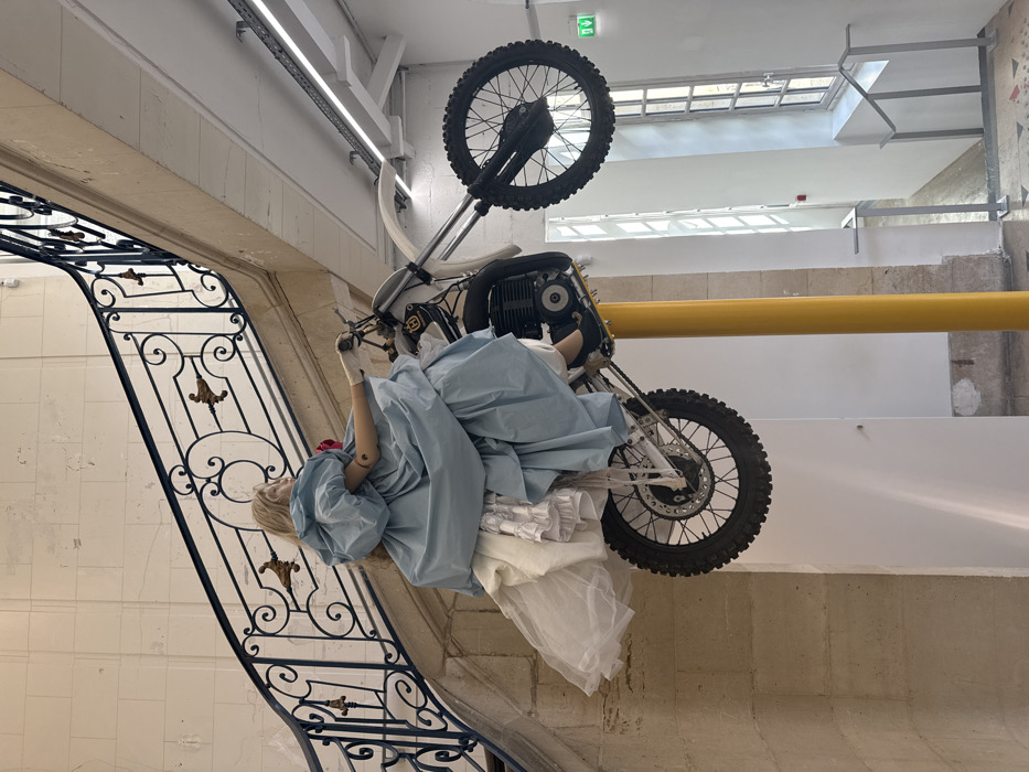 An art installation is prominently displayed within the historic interior of the Musée des Arts Décoratifs (MAD Paris), located at 107 Rue de Rivoli, in the 1st arrondissement of Paris, France. A blonde mannequin, wearing a voluminous light blue gown with puffed sleeves and layered white undergarments, is positioned astride a vintage Husqvarna motocross motorcycle. The mannequin wears white gloves and black shoes, with a small red embellishment near her chest. The motorcycle, black and white, featuring knobby tires, is suspended mid-air at an upward angle, as if in ascent, supported by a thick, bright yellow pole. In the background, a grand, curving stone staircase with an ornate dark metal railing, featuring intricate scrollwork and gilded accents, ascends to the left. The walls are constructed of pale stone. Modern track lighting is visible on the white ceiling. To the right, tall, multi-paned windows allow natural light into the space, with a green exit sign positioned above them. A grey metal handrail is also visible below the windows, indicating a lower level or ramp.