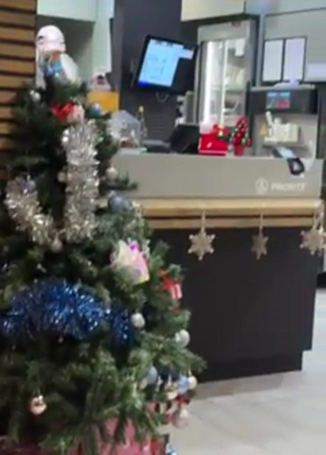 inside of a McDonald's restaurant decorated for Christmas. A Christmas tree stands near the counter, adorned with silver and blue tinsel, ornaments, and wrapped gifts beneath. The counter has a "PRIORITE" sign, and decorative snowflakes hang from it. Red pendant lights hang from the ceiling, and a "Merry Christmas" banner is visible. There are displays with pastries and other items behind the counter, along with a small Christmas tree and a stuffed animal wearing a Santa hat. The interior design features a modern look with black and tan horizontal wood paneling. The restaurant appears clean and well-lit.