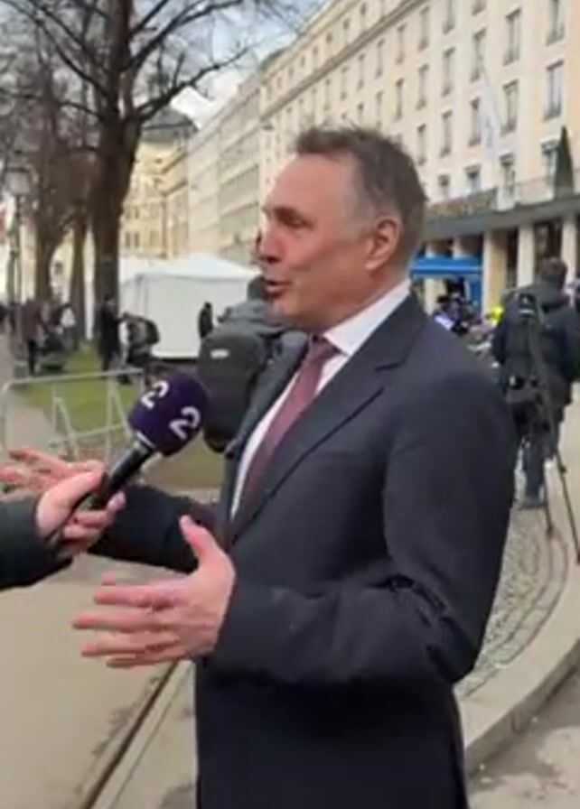 middle-aged man in a dark suit and tie being interviewed outdoors