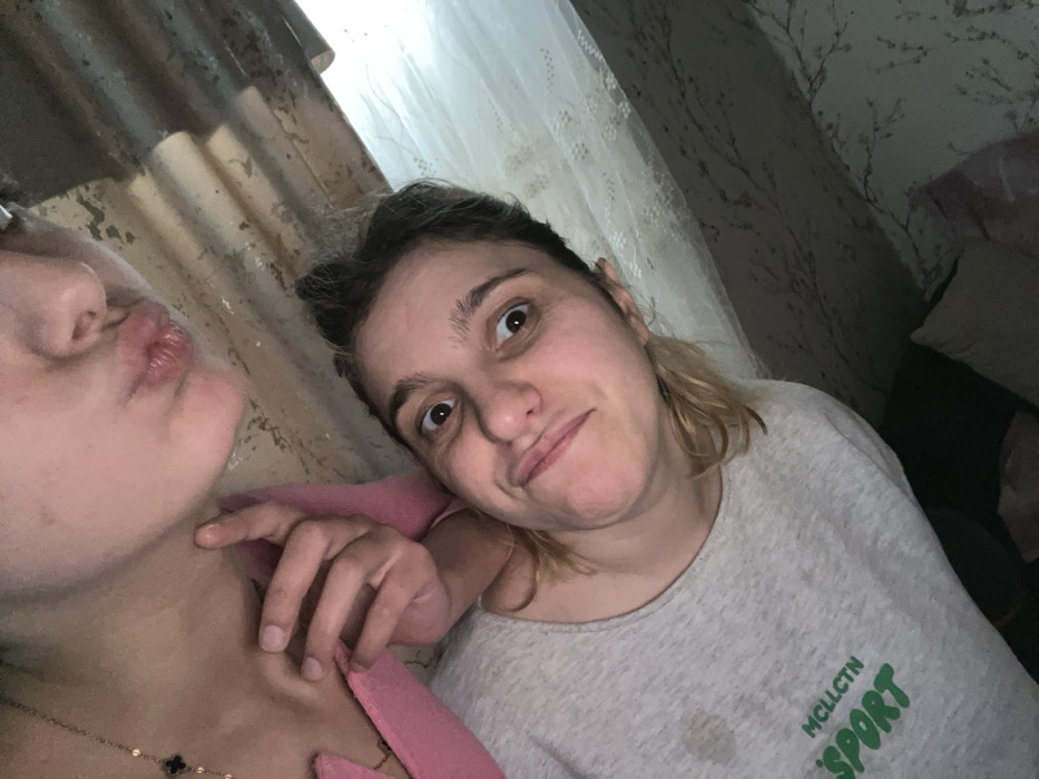 The image depicts two individuals in a close-up, tilted indoor setting. In the foreground, a person with light brown hair, appearing to be pulled back, looks directly at the camera with wide eyes and a slight smirk, their lips slightly pursed. This individual wears a light grey short-sleeved t-shirt with a visible dark stain on the upper left chest and green text that reads "MCLLCTN SPORT." Partially visible in the upper background is the chin, mouth, and neck of a second individual, making a "kiss" face with pursed lips. This person wears a pink top and a gold chain necklace featuring a small, black, four-leaf clover-shaped pendant. A hand, likely belonging to the second individual, is seen resting on the foreground person's left shoulder and neck area. The background features a corrugated or ridged light-brown surface, possibly a ceiling or wall, above the individuals. To the right, a white, semi-sheer curtain with a patterned design is visible, extending down to reveal a light-colored patterned wallpaper and a light-colored pillow or cushion. The environment appears to be an interior room. The specific location within the city of Lanchkhuti, Georgia, is not discernible from the visual evidence presented.