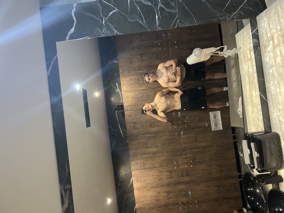 The image displays two young adult males in a mirror selfie taken within a modern changing room or locker facility in Botevgrad, Bulgaria