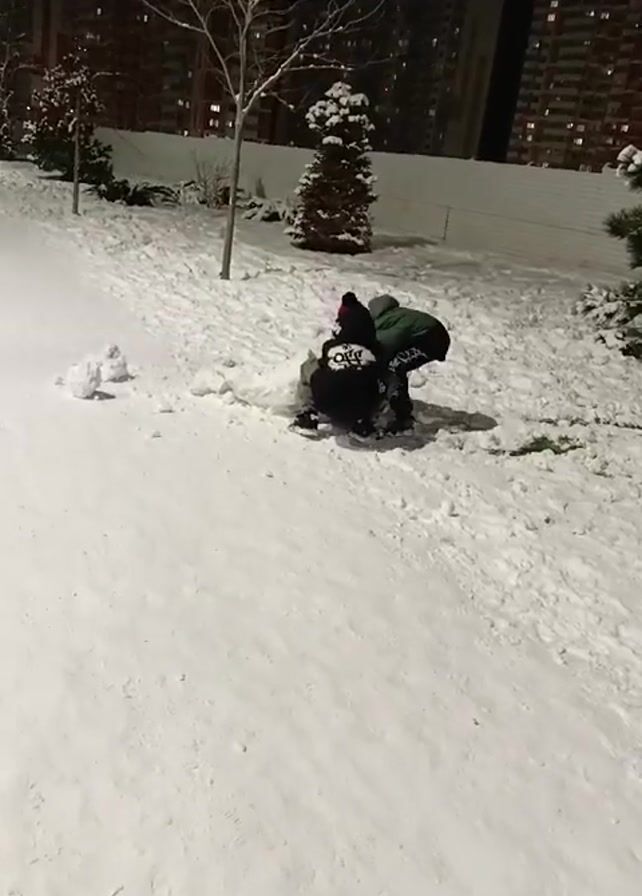 Two children are building a snowman in a snowy area at night. The child closest to the camera is wearing a black jacket, camouflage pants, and black sneakers, and a black and red hat. The second child is wearing a dark green jacket and pants. They are near a snow-covered area with small evergreen trees and bare deciduous trees in the background. Behind the trees, there are several tall apartment buildings with lit windows. They are packing snow together to form the snowman.