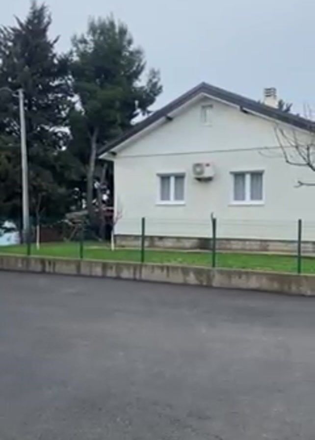 white one-story house on a cloudy day. The house has a dark gray roof, white window frames, and a green fence surrounding the small yard. In the background, there is a swimming pool and more greenery. The camera slowly pans to the right, revealing more of the property. The ground in front of the house is paved.