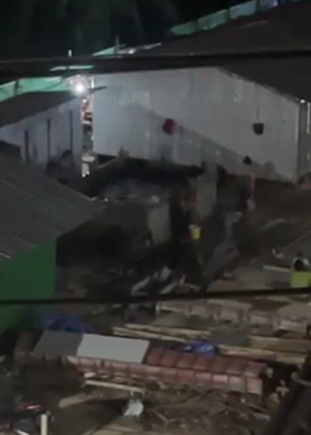 At night, an elevated shot shows an outdoor area with buildings covered in corrugated metal. Several people walk around, sometimes carrying objects like buckets. Debris such as wood planks and tarps are scattered on the ground in the foreground. A light source in the distance illuminates the scene, casting shadows from the buildings.