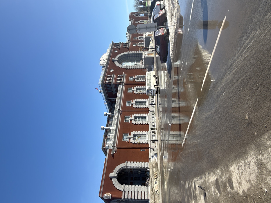 The image displays the Kursk Railway Station (Kursk-1) in Kursk, Russia, on a clear, sunny day. The prominent multi-story building features a red brick facade with white decorative cornices, balustrades, and window surrounds, along with gray stone or granite accents around large arched entrances and lower sections. A Russian national flag is affixed to the rooftop towards the right. The leftmost section of the building, characterized by a large arched portal, exhibits visible construction or renovation elements, including materials on the ground. Several small, indistinct human figures are visible on the sidewalk in front of the building. A white minibus is positioned near the station's entrance. The foreground consists of a paved roadway largely covered by extensive puddles of standing water, which reflect the building and sky. White road markings are partially visible beneath the water. Patches of dirty, melting snow accumulate along the right edge of the roadway, adjacent to several parked passenger vehicles, including a dark red hatchback. A round, white road sign is also visible on the right.