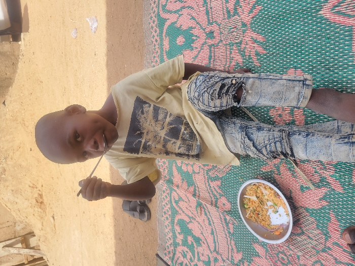 A young boy in a tan shirt and distressed jeans is seated on a patterned mat outdoors, possibly enjoying a meal. He holds a spoon to his mouth, his gaze directed at the viewer. A dish containing rice or noodles is placed beside him on the mat. In the background, there's a sandy or dirt area and a partial view of a building. Footwear is nearby, suggesting a relaxed, informal setting.