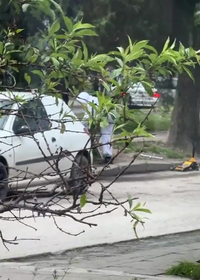 street scene from inside a building. The camera focuses on a person dressed in a white protective suit, seen working near a white car parked on the side of the road. The view is initially partly obstructed by branches and foliage, then reveals more of the street. There's a small building with a reddish-brown roof on the right side of the frame. The sidewalk is made of patterned paving stones, and a small garden is seen with various plants, including what appears to be orange poppies. Other cars are parked further down the street, and trees line the road. The scene appears to be overcast, with muted natural lighting.
