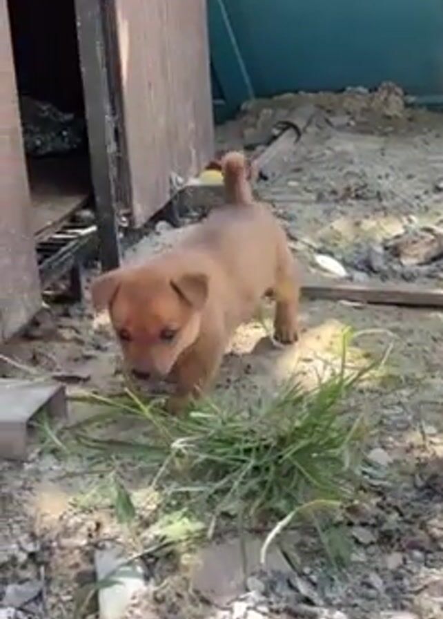 A small, light brown puppy with a curled tail stands on dirt strewn with debris and tufts of grass