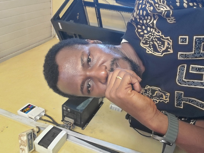 The scene depicts a single adult male positioned indoors in Sabon Tasha, Nigeria. The individual has a dark complexion, short dark hair, a beard, and a mustache. He is wearing a dark long-sleeved shirt adorned with gold and silver patterns, including a sequined "TGL" inscription on the chest. A grey smartwatch with a ribbed band is on his left wrist, and a gold ring is on his right ring finger, which is fisted and held near his chin. The background features a yellow-painted wall where various electrical components are mounted. These include a white electrical distribution board, two smaller white boxes, one of which is labeled "ZVA" and has visible cable connections, and a black electronic device with exposed wiring. To the subject's right, a black metal server rack with multiple open bays is visible. The ceiling is white and appears to be constructed from panels.