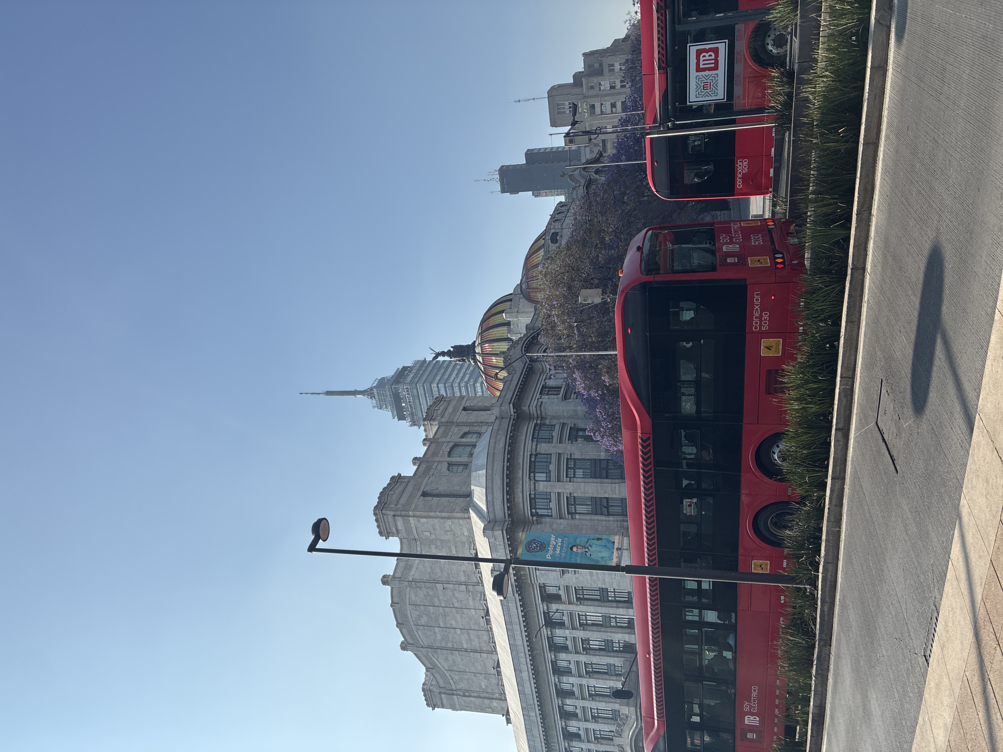 This daylight image depicts an urban street scene in Mexico City, Mexico, under a clear blue sky. In the immediate foreground, a paved road transitions to a narrow median featuring green foliage. Two red electric Metrobús buses are positioned on the road; the bus on the left displays 'SOY ELÉCTRICO' and 'conexion 5030' on its side, with indistinct passenger figures visible through its windows. A black streetlamp pole is centrally located, from which a blue banner hangs, featuring a man in uniform and the text "Proteger y Servir." In the background, the Palacio de Bellas Artes, a large grey stone building with a distinctive multi-domed roof and classical architectural elements, is prominently situated. To the right and behind the Palacio de Bellas Artes, the Torre Latinoamericana, a tall skyscraper with a spired antenna, rises against the skyline. Purple-flowering trees are visible around the Palacio de Bellas Artes. Further to the right in the background, additional urban buildings are visible, one featuring a "SEARS" sign. Sunlight illuminates the scene, casting shadows on the road and foreground elements.