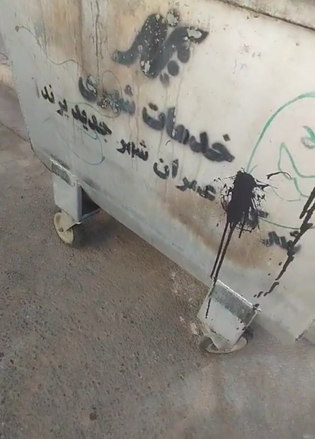 person walking a small, light-brown dog on a leash past a large metal dumpster. The dumpster has graffiti on it in a language other than English. Next to the curb, near the dumpster, is a plastic bag, a white container, a few empty water bottles, and scattered bits of fruit peelings and whole, small fruits. The person filming wears black jeans and black flip-flops. The dog is walking to the right.