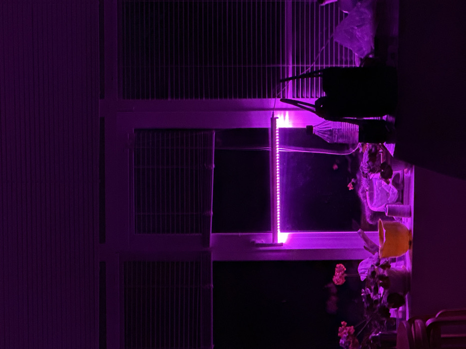 A window with closed blinds is illuminated with a strong, purple light. A light panel stands in the center of the window. A variety of plants and gardening supplies clutter the window sill, including pots, a watering can, and plastic bags. The intense purple light casts a strong hue over the entire scene.