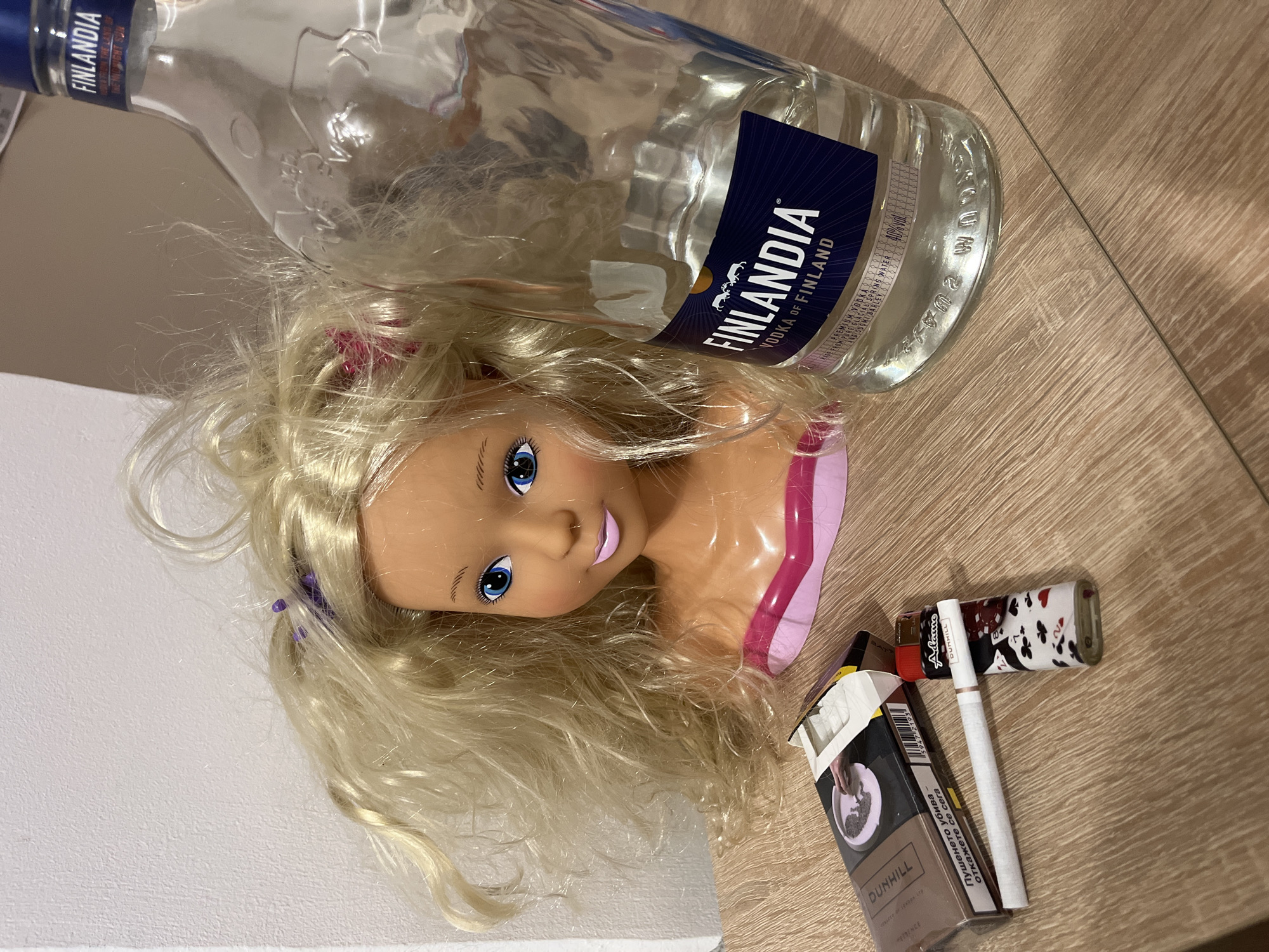 The image displays an indoor scene in Pernik, Bulgaria, featuring several objects arranged on a light brown wood-grain surface, positioned against an off-white textured wall. A large blonde doll's head, possibly a styling mannequin, occupies the left side of the frame. The doll has blue eyes, light pink lips, and disheveled blonde hair secured with small purple and pink clips. Its torso is a molded pink plastic bust. To the right, a clear glass bottle of Finlandia Vodka, predominantly empty with a blue screw cap and dark blue label, is positioned upright. In the foreground, below the doll's head, an open brown and white pack of Dunhill cigarettes reveals multiple white filter cigarettes and a Bulgarian health warning label, which translates to "SMOKING KILLS - QUIT NOW." A single unlit white cigarette lies horizontally across a white disposable lighter adorned with a red and black playing card suit pattern, bearing the brand names "Adamo" and "Dunhill." No individuals are present, and all depicted items are static.