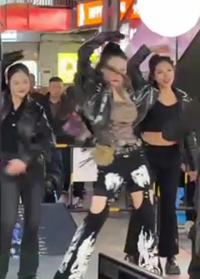 group of women dancing in an urban outdoor setting. They are all wearing black leather jackets, with the woman in the center also wearing black and white patterned pants with cutouts. The woman in the center has her hair pulled back in a high ponytail. There are other people standing and watching in the background, and city buildings and lights can be seen in the surrounding area. There's also electronic equipment visible in the foreground, perhaps related to the performance.