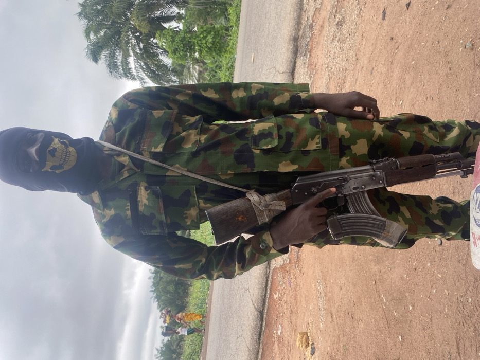 An individual stands centrally in the foreground of a scene in Wukari, Nigeria. The subject, an adult, wears a full camouflage uniform consisting of a long-sleeved shirt and trousers, patterned in green, brown, and black. A black balaclava covers the entire head, featuring a yellow/gold skull design over the facial area. The individual holds an AK-pattern rifle in the left hand, positioned downwards. The rifle has a wooden stock and foregrip, with a light-colored fabric or rope material tied around the stock. A metal magazine is inserted into the weapon. A light-colored strap, consistent with a rifle sling, is visible draped over the individual's right shoulder. The scene is set outdoors, with the individual standing on reddish-brown earth beside a grey asphalt road. In the mid-ground to the left, along the road, two or more civilians are visible walking away from the viewer; at least two are women, one appearing to carry an item on her head. The background features dense tropical vegetation, including numerous palm trees and various green bushes, indicative of a rural or semi-urban environment in Wukari, Taraba State. The sky is uniformly overcast with grey clouds. The primary subject is stationary, while the background individuals are in motion. No direct interaction between the primary subject and the background individuals is depicted.