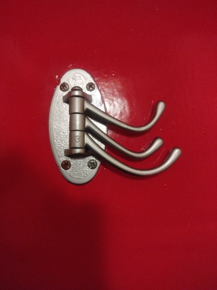 - "A wall-mounted, silver-toned metallic triple coat hook is affixed to a vibrant red, glossy surface, likely a wall or door, within a building in Nairobi, Kenya" by FM-gef792, licensed under CC BY 4.0