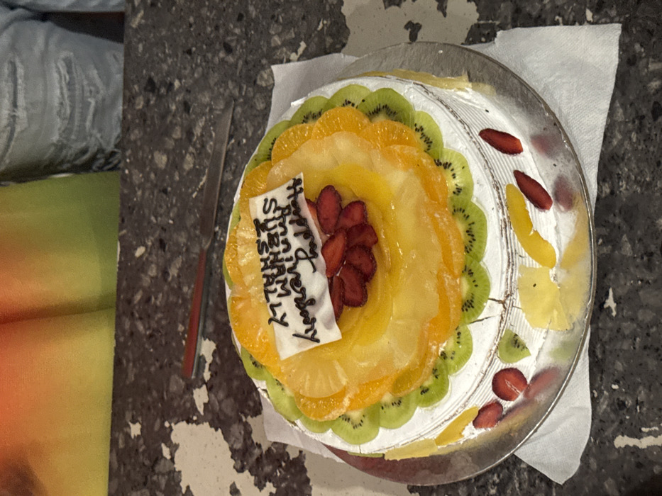 A round cake rests on a transparent plate atop a white napkin. The cake is decorated with a variety of sliced fruits, including kiwi, orange, pineapple, and strawberries in the center. A small white piece of paper, with handwritten text on it, is also on the cake. The cake plate rests on a grey textured surface. A knife is placed next to the cake. In the background, part of what appears to be a sofa or bed is visible.
