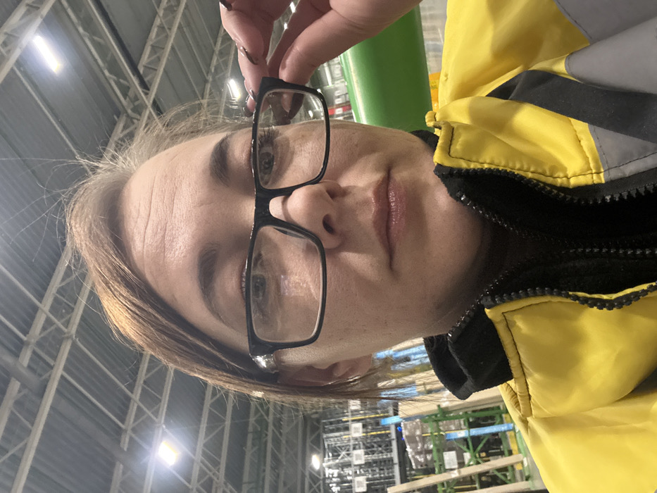 A close-up, front-facing image captures an adult female in an indoor industrial or warehouse environment. The subject has light brown hair, pulled back, with some flyaways. She wears black-framed rectangular eyeglasses and is touching the left temple of the glasses with her left hand, which has dark nail polish. She is dressed in a bright yellow collared jacket with gray reflective strips on the shoulders, worn over a black zippered inner garment. Her expression is neutral. The background reveals a high ceiling with exposed metal trussing and bright overhead lighting. To the left, a tall metal shelving or racking system is visible, possibly storing items. To the right, a large, curved, bright green structure or object is partially present. The specific location within Lupanovo, Russia, cannot be determined from the visual information provided; however, the environment suggests a commercial or logistics facility.