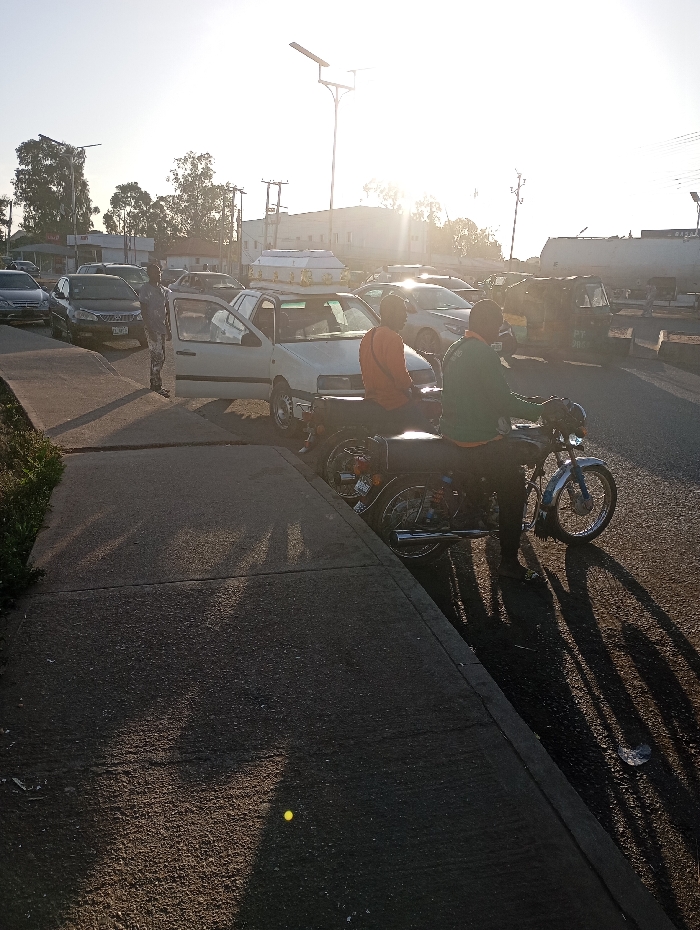 The image depicts a street scene in Jos, Nigeria, characterized by bright, low-angle sunlight creating prominent shadows, suggesting either early morning or late afternoon. In the mid-ground, a white Volkswagen Golf Variant (likely a Mk3 or Mk4 model) is stationary on the asphalt road, with its front passenger door open. A white coffin or casket, featuring gold-colored trim and what appear to be floral decorations, is secured to the vehicle's roof. Standing next to the open car door is a male individual, dressed in light-colored trousers and a patterned long-sleeved shirt, facing towards the rear of the car. To the right of the white car, two male individuals are seated on a dark-colored motorcycle, which is also stationary at the roadside. The person in front wears an orange long-sleeved shirt, and the person behind wears a green long-sleeved shirt. Their shadows stretch across the road and onto the concrete sidewalk in the foreground, where a small patch of green vegetation is visible on the far left. In the background, multiple vehicles are visible, including several parked or queued cars (one dark sedan, one silver sedan), a green and yellow motorized tricycle (keke napep), and a large white tanker truck further down the road. Buildings are partially visible in the distance, obscured by the bright sun glare. Tall, solar-powered streetlights and utility poles with overhead lines are present throughout the scene. The sky is bright with strong sun reflection.