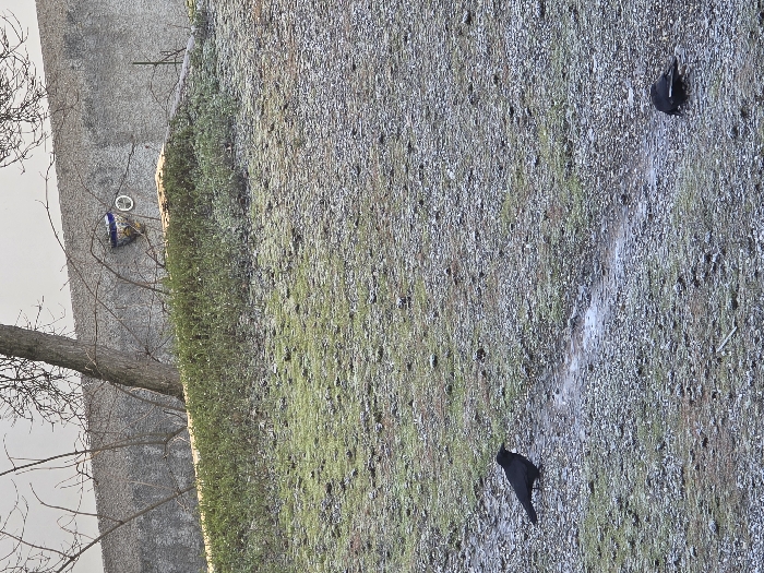 An outdoor scene in Unknown, Unknown depicts a sloped ground covered with light gray gravel and sparse green and brown vegetation, under an overcast sky