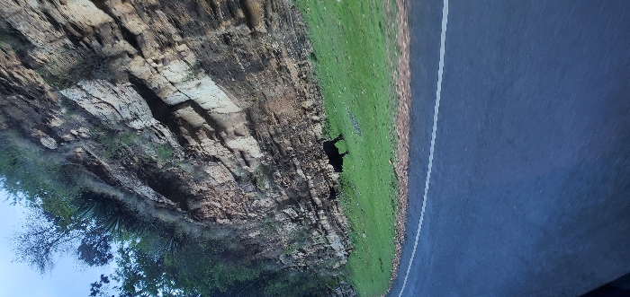 A layered rock face stands beside a narrow strip of green grass, next to a paved road. The rock displays hues of tan and brown. Two dark figures, possibly animals, stand on the grass near the rock face. Patches of trees and blue sky are visible. The road is likely wet.
