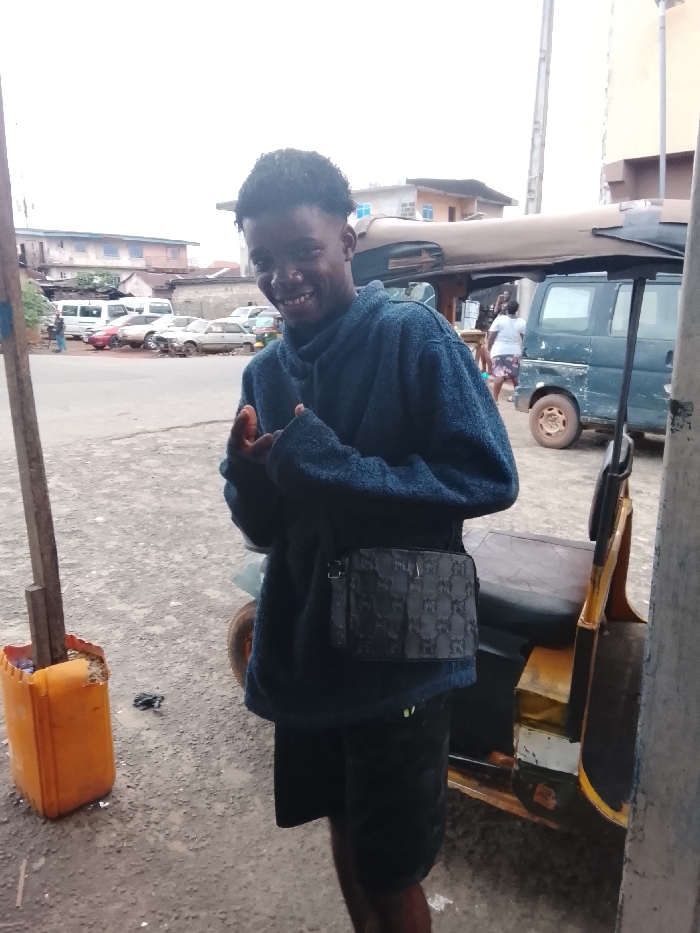 The image depicts a daytime street scene in the city of Umuahia, Nigeria. In the foreground, a young male with dark skin and short, dark, textured hair stands centrally. He is wearing a dark blue hooded sweatshirt and black shorts, with a dark, patterned cross-body bag slung over his shoulder. He is smiling broadly, looking directly towards the camera, and holds both hands near his chest with fingers curled. To the subject's left, a wooden pole is vertically inserted into an orange plastic container, possibly a cut-open jerry can, filled with soil. To the subject's right, the rear section of a yellow and black tricycle, including its seat and a portion of its canopy structure, is partially visible. The ground is unpaved, consisting of dirt or gravel. In the mid-ground and background, an open area or street features multiple parked vehicles. These include several older model sedans, some appearing derelict (e.g., a white car missing its bumper, a red car), a white van, and a dark blue or green minivan. Two indistinct human figures are visible in the background: one wearing a white top and patterned skirt near the minivan, and another smaller figure further back near the white van. Beyond the vehicles, various multi-story buildings, characteristic of an urban environment, are visible under an overcast sky.