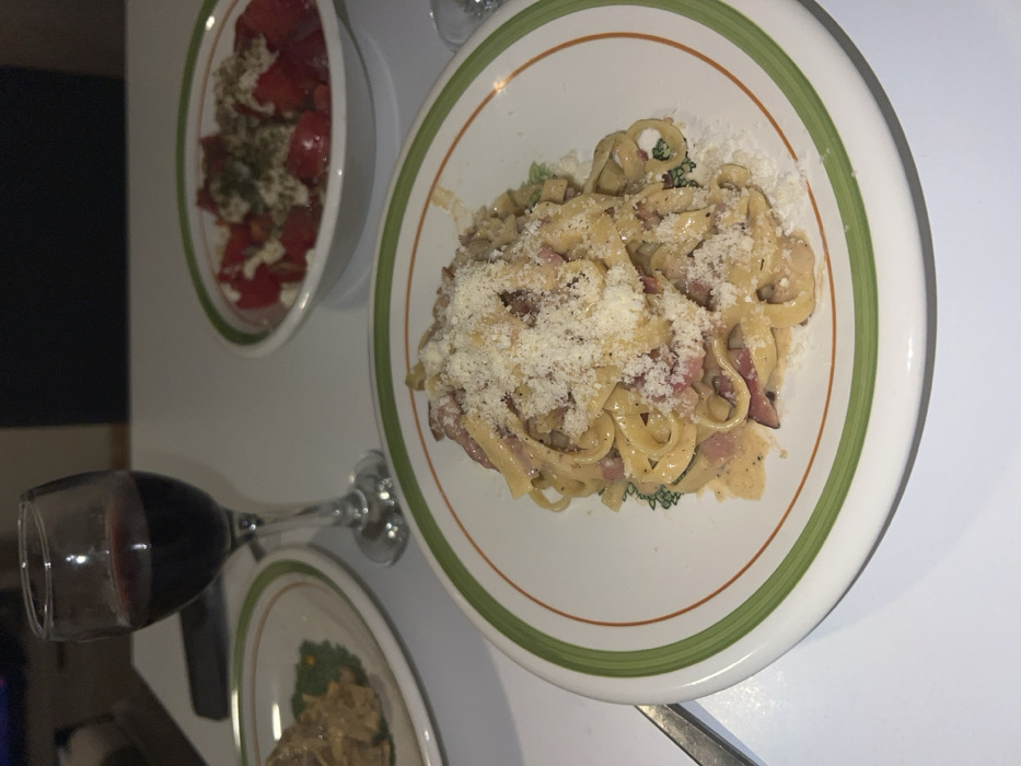 The image displays an indoor dining scene on a white, reflective table surface. Centered in the foreground is a white ceramic plate featuring a green and orange rim, holding tagliatelle pasta coated in a creamy sauce with pieces of cured pork, generously topped with grated white cheese and black pepper. To the immediate left, a stemmed wine glass contains red wine. A second white ceramic plate, identical in design and partially visible on the far left, contains an indistinct portion of another pasta dish. In the mid-ground, towards the right, a small white bowl with a matching green and orange rim contains diced red tomatoes, crumbled white cheese, and dried green herbs. A dark, rectangular object, consistent with a smartphone, is positioned on the table between the wine glass and the left plate. A silver piece of cutlery is partially visible on the far left edge. The background is dark and out of focus, indicating an interior setting with indistinct furniture. No individuals are present in the scene. The precise location within the city of Tivat, Montenegro, cannot be determined from the visual information provided.