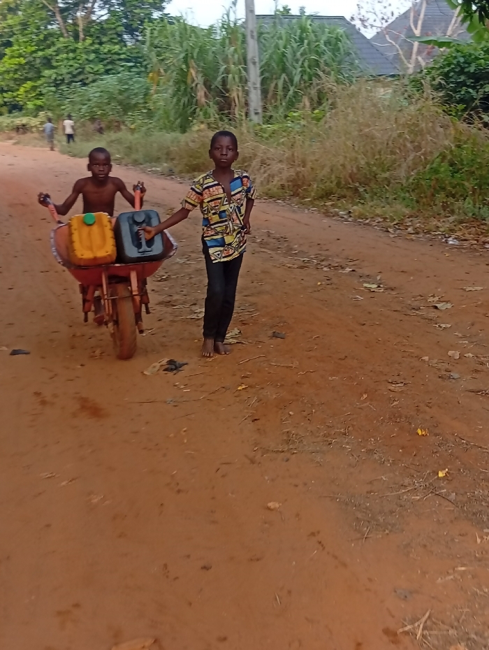 Two young boys are on a red dirt road. One shirtless boy sits in a red wheelbarrow, holding two plastic containers, one yellow and one black. The other boy, wearing a patterned shirt and black pants, walks alongside the wheelbarrow, pushing it. The ground is littered with debris. In the background, there is green foliage and trees. In the distance, two other figures are walking.