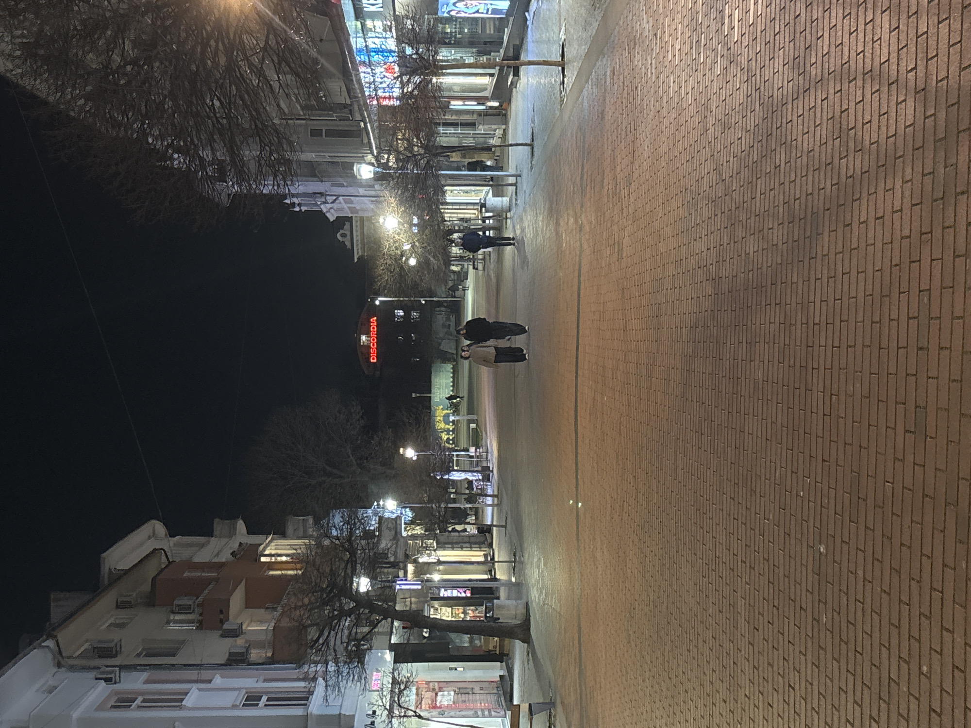 The image depicts a nighttime view of Ulitsa Preslav (Preslav Street), a pedestrianized street in the city center of Varna, Bulgaria. The perspective is directed generally east/southeast, with the Business Hotel Discordia sign visible as a prominent red neon landmark in the distance. The street is paved with reddish-brown bricks laid in a stretcher bond pattern, appearing slightly reflective under the artificial light. Multi-story buildings line both sides of the street. On the left, facades are predominantly light-colored with some reddish-brown sections, featuring balconies, windows, and visible air conditioning units. The ground floors house retail establishments with brightly illuminated display windows. Similarly, on the right, buildings feature illuminated storefronts at ground level. Numerous bare deciduous trees are interspersed along the street, planted in rows between the pavement and the buildings, their branches silhouetted against the dark night sky. Modern, pole-mounted streetlights provide white artificial illumination along the entire visible length of the street, casting light onto the pavement and buildings. In the midground, three individuals are walking away from the camera. Two are walking together slightly left of center; one wears lighter outerwear and dark pants, the other dark outerwear and dark pants. A third individual, dressed in dark clothing, walks further ahead on the right side of the street near the shopfronts. Additional, more distant figures are faintly visible further down the street. Other objects include wooden benches positioned along the sides of the street, cylindrical public waste bins, and a bicycle rack with one bicycle on the far right in the distance. A partial Cyrillic sign, displaying "ВАРНА" (VARNA), is discernible on a building on the right side in the background. Overhead wires are faintly visible against the dark sky. The overall scene is well-lit, suggesting a bustling urban environment at night with moderate foot traffic.