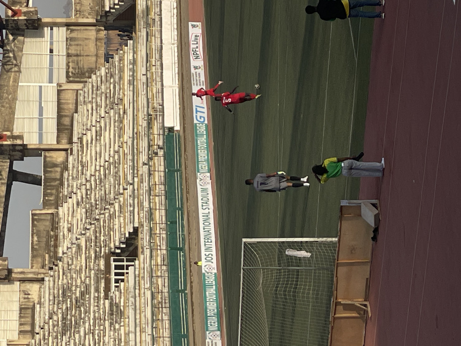 The image displays an outdoor football (soccer) stadium, identified by a prominent banner as Jos International Stadium, located in Jos, Nigeria