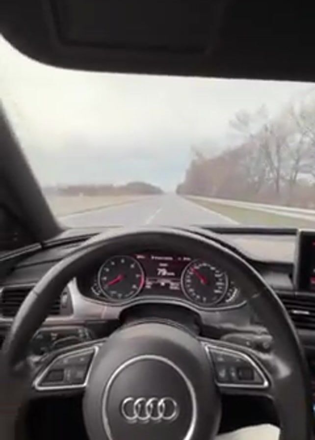 A first-person perspective video shows the interior of a moving car, likely an Audi